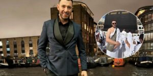 Aktorja 42-vjeçare u shfaq me xhinse blu, çizme të zeza dhe një xhaketë të artë me shkëlqim, shkruan DailyMail.