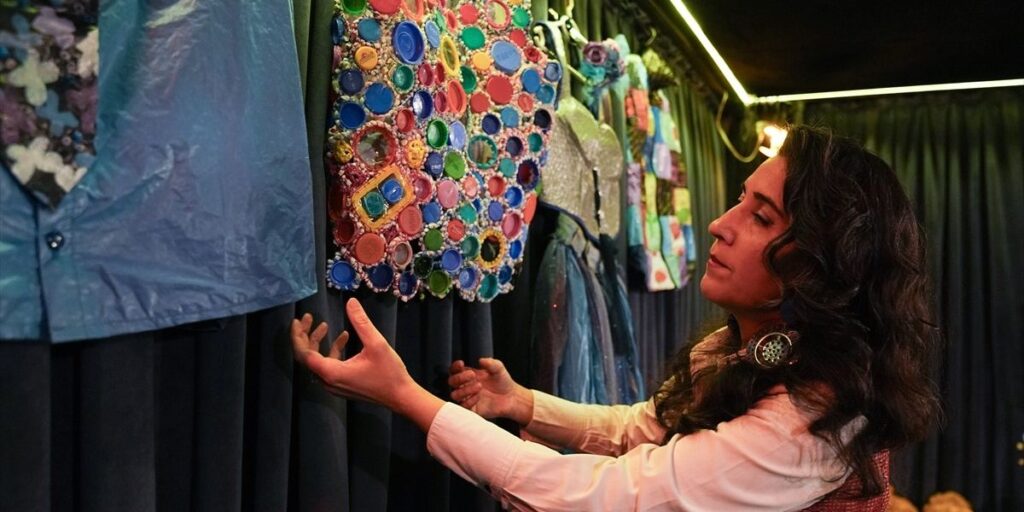 Ruken Adibelli dizajnon kostume dhe aksesorë duke përdorur materiale mbeturinash që mbledh nga natyra dhe qyteti, kryesisht qese plastike.