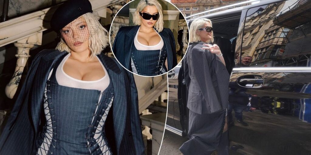 Veshja e saj spikat me një fustan/korsetë në tonalitet blu të errët, me detaje lidhëse anash që theksojnë siluetën, ndërsa sipër ka hedhur një xhakete të gjerë me vija, e vendosur mbi supe në stilin e modeleve në tapetin e kuq.