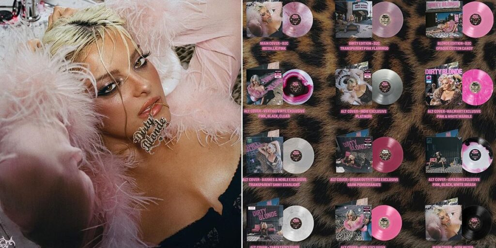 Një nga detajet që bie më shumë në sy është zinxhiri/aksesor i artë që mban në gojë, ku shkruhet titulli “Dirty Blonde”, një simbolikë që e bën kopertinën edhe më të komentueshme dhe e lidh drejtpërdrejt me identitetin e albumit. Në sfond shihen edhe aksesorë të tjerë, që e plotësojnë atmosferën “fashion editorial” dhe e bëjnë të duket si një kopertinë e menduar për të treguar një histori, jo vetëm një fotografi.
