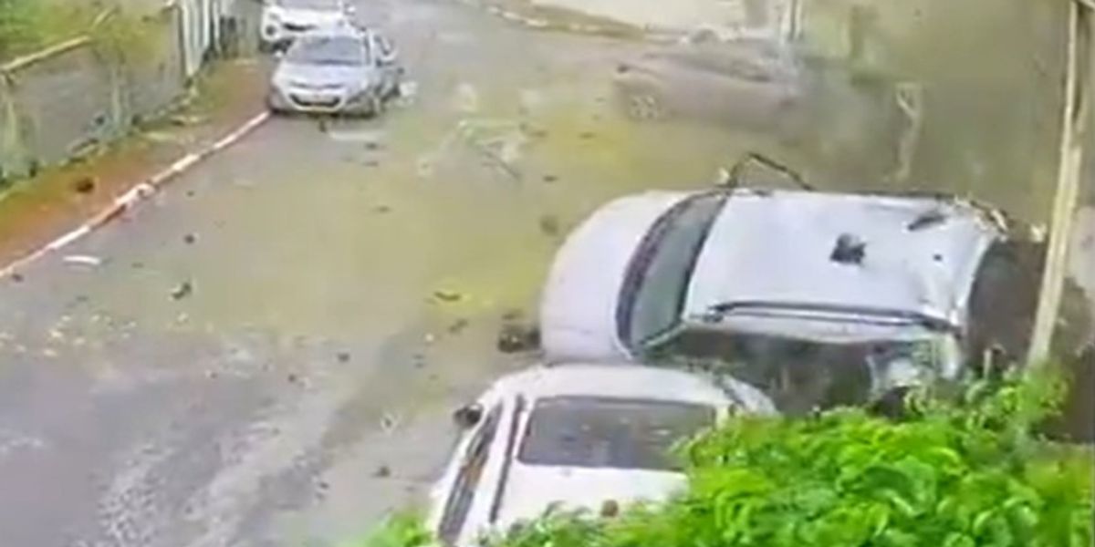 Vetëm pak sekonda më vonë, një nga bombat e vogla – pjesë e një municioni thërrmues – godet afër, duke shkaktuar një shpërthim të fuqishëm që përmbys dy automjete në zonë.